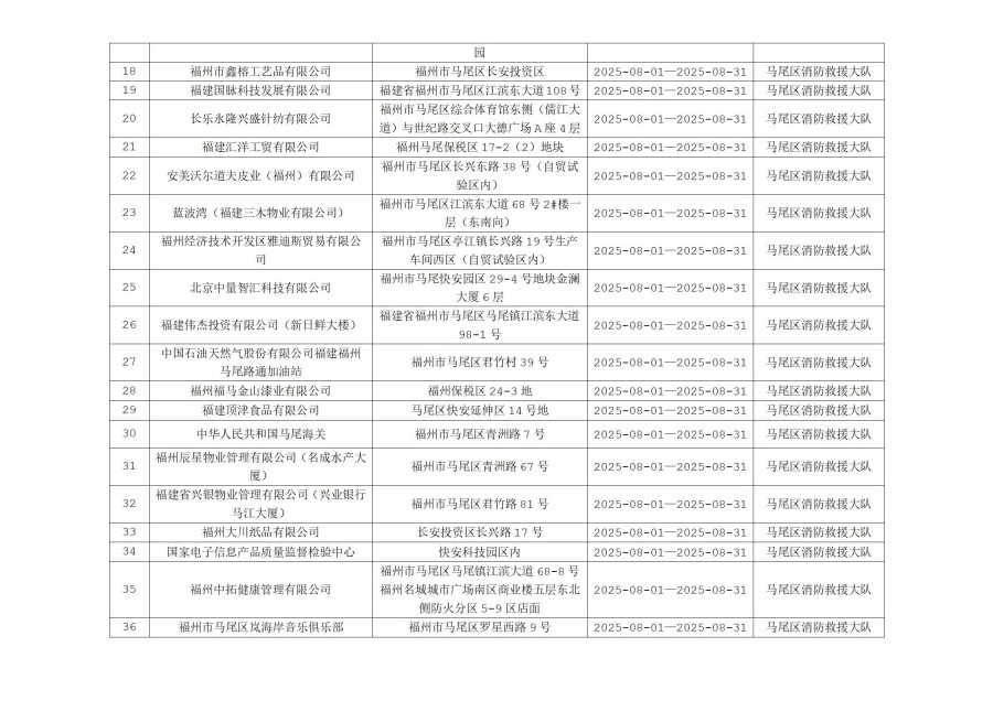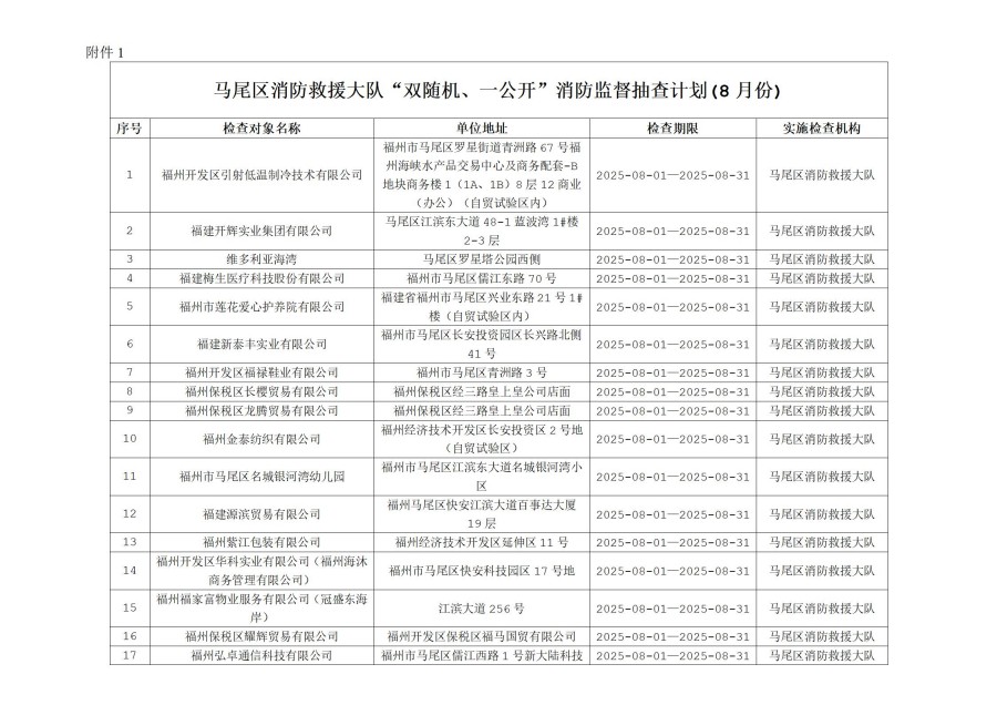 附件: 1. 马尾区消防救援大队“双随机、一公开”消防监督抽查计划(8月份)