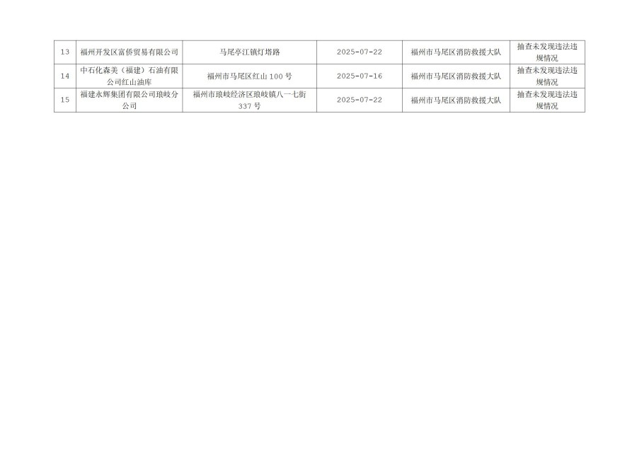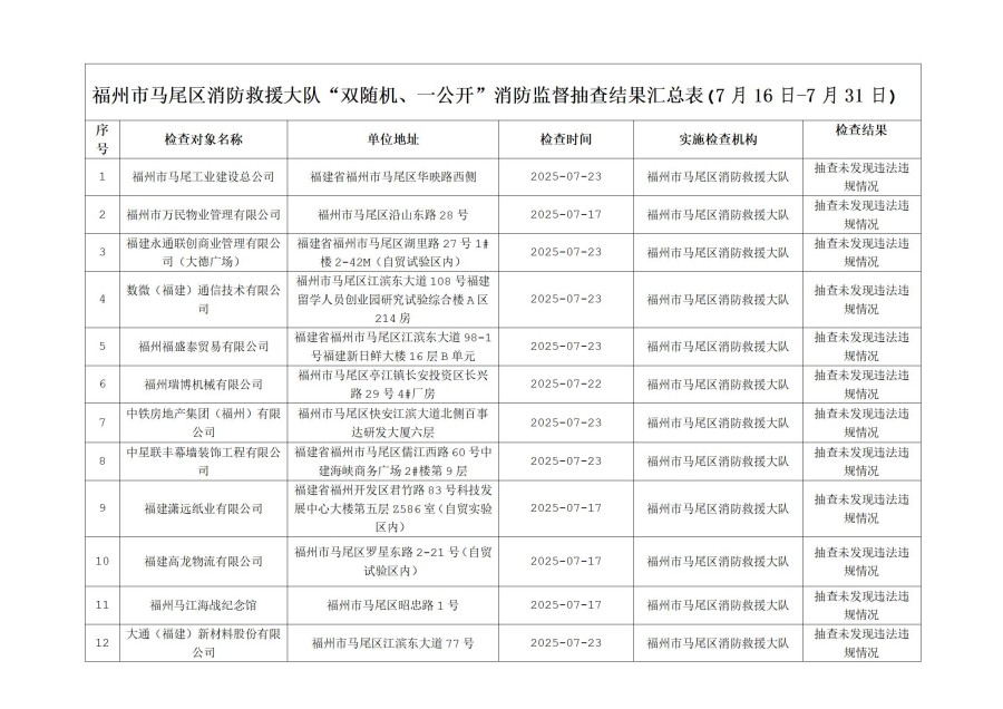 按照福建省消防救援总队《关于开展“双随机、一公开”监督抽查工作的通知》文件要求,2025年7月16日至31日,福州市马尾区消防救援大队对消防监督系统中随机抽取的单位进行了检查,现将检查结果向社会公示,具体抽查结果公示如下: