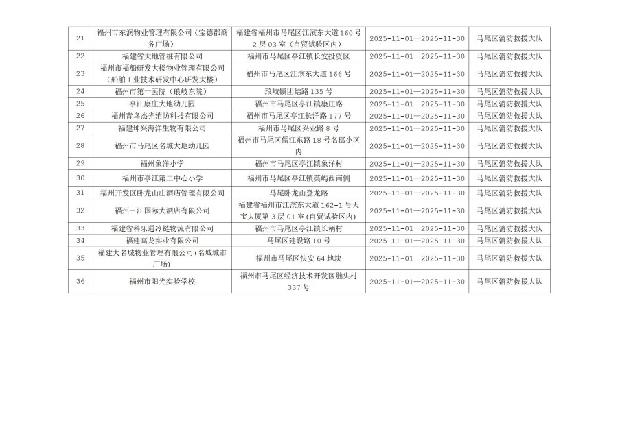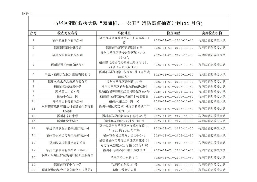 附件: 1. 马尾区消防救援大队“双随机、一公开”消防监督抽查计划(11月份)
