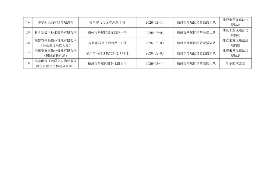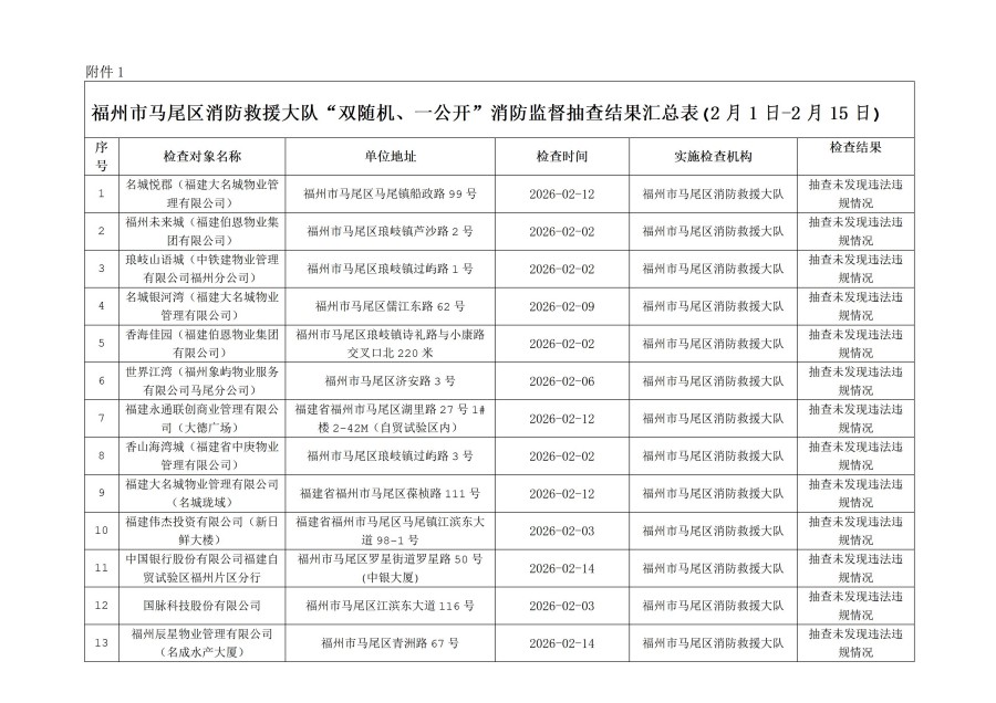 按照福建省消防救援总队《关于开展“双随机、一公开”监督抽查工作的通知》文件要求,2026年2月1日至15日,福州市马尾区消防救援大队对消防监督系统中随机抽取的单位进行了检查,现将检查结果向社会公示,具体抽查结果公示如下: