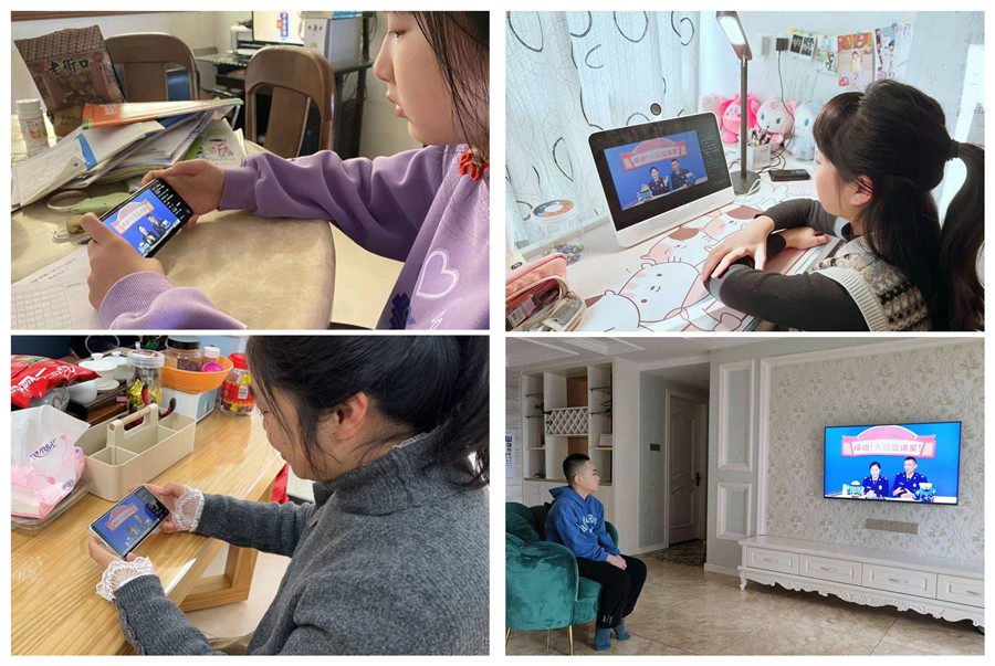 收看过程中,全体师生通过手机、电脑、平板等方式观看,直播围绕“消防科学课”、“消防课间操”、“消防便利店”、“消防劳动课”、“消防地理课”、“消防结业考试”等六个章节开展沉浸式科普直播活动。