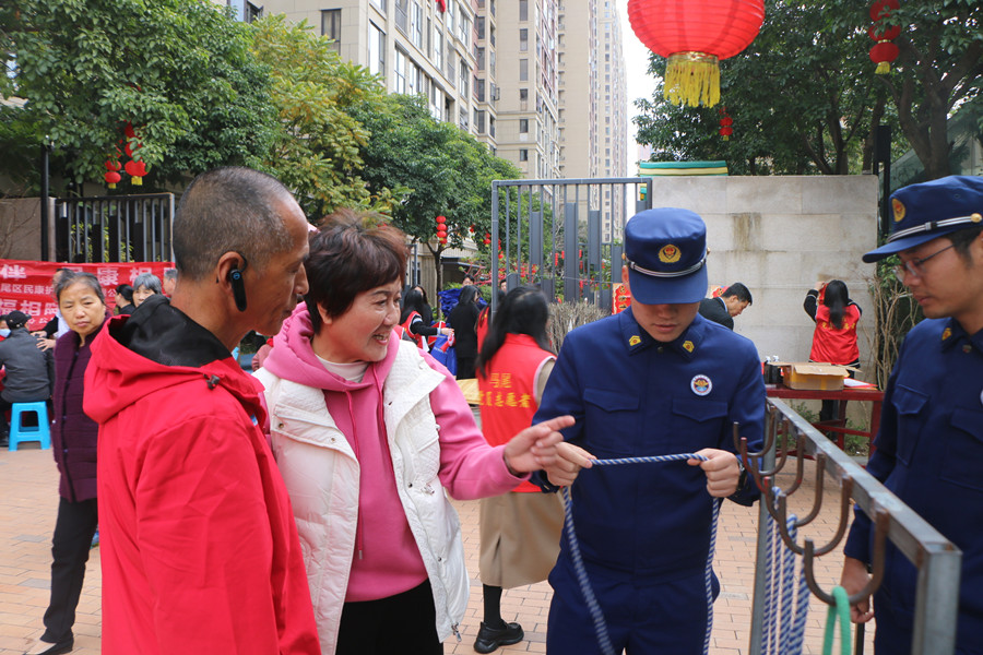 同时,消防救援人员和消防志愿者们教授社区居民简易绳结制作、如何正确使用消防器材、如何疏散逃生等消防安全知识,向社区居民发放《电动车火灾防范》、《居家消防安全常识》等消防宣传资料。