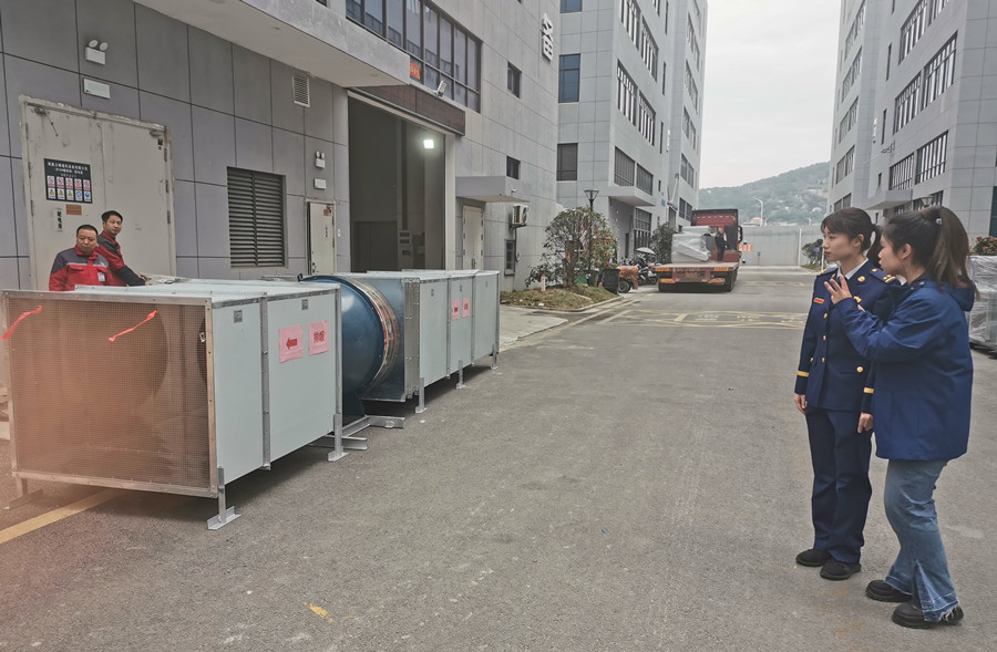 [监督员]我身后是一台11千瓦的排烟机,我们将烟雾弹放置在风机内,看多久能将烟雾排出去。