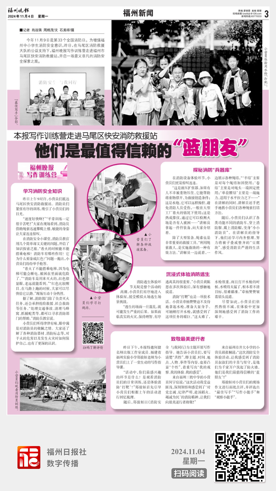 今年11月9日是第33个全国消防日,为增强中小学生消防安全意识,11月3日,福州晚报写作训练营做进马尾区快安消防救援站,开启一场意义非凡有“知”有“味”的消防安全探索之旅。